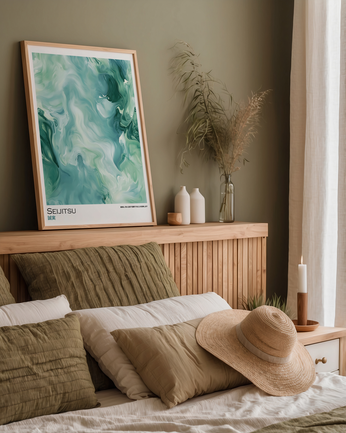 Den abstrakta Seijitsu-posten skildrar en mjuk virvlande rörelse i blågröna toner – som dimma över skog eller stilla vatten i gryningsljus. En känsla av ärlighet, flöde och balans – utan en tydlig plats, men med ett tydligt lugn.