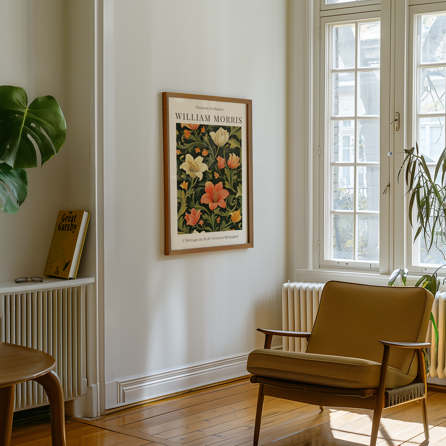 En förtrollande blomsterdröm i sann William Morris-stil. De varma, organiska formerna slingrar sig i mjuka rörelser och skapar en symmetrisk harmoni av färg och detaljer. Den här postern ger ett klassiskt men levande uttryck – perfekt för rum där du vill kombinera elegans med tidlös blomsterprakt.
